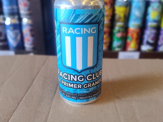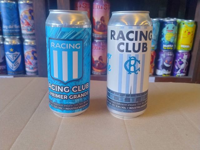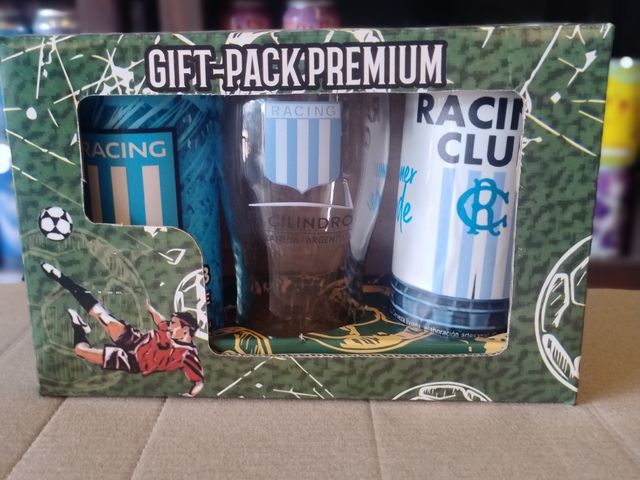 Estuche exclusivo Racing Club, contiene 2 latas de cerveza con diseño de Racing y 1 vaso pinta de vidrio.