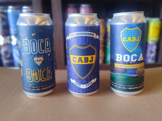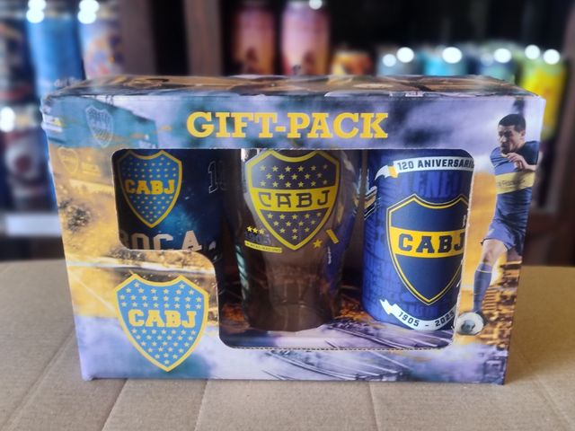 Estuche exclusivo Boca Juniors, contiene 2 latas de cerveza con diseño de Boca y 1 vaso pinta de vidrio.