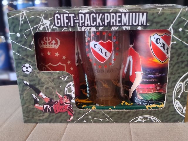 Estuche exclusivo Independiente, contiene 2 latas de cerveza con diseño de independiente y 1 vaso pinta de vidrio.
