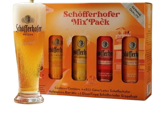 El estuche Schofferhofer Vaso + 4 Latas de 500cc es un pack de cerveza de trigo alemana, refrescante y frutal, que incluye 4 latas de 500 ml de sabores variados (como pomelo, piña, sandía) y un vaso