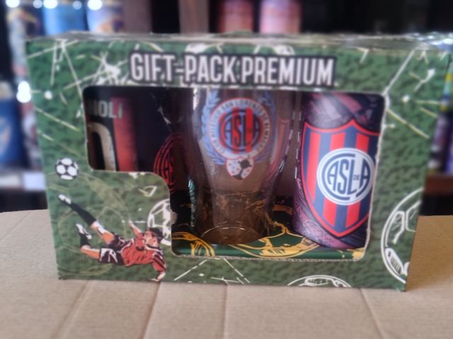 Estuche exclusivo San Lorenzo, contiene 2 latas de cerveza con diseño de Boca y 1 vaso pinta de vidrio.