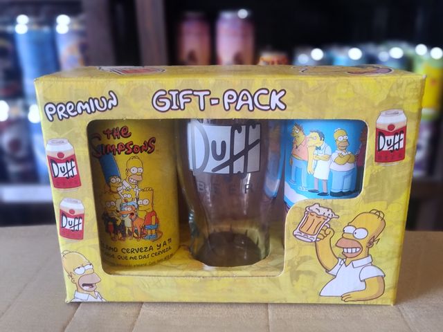 Estuche exclusivo Los Simpsons, contiene 2 latas de cerveza con diseño de Los Simpsons y 1 vaso pinta de vidrio.